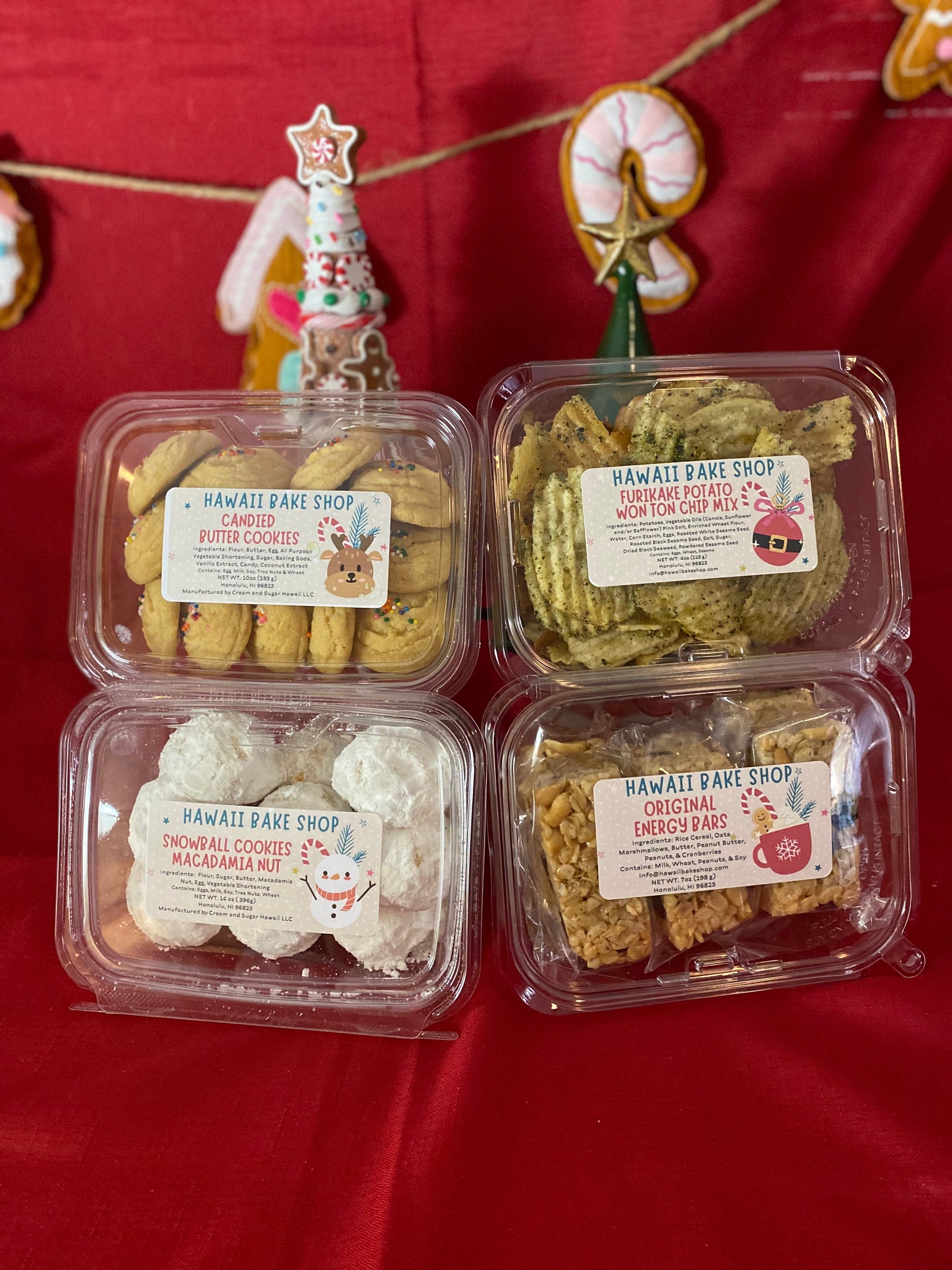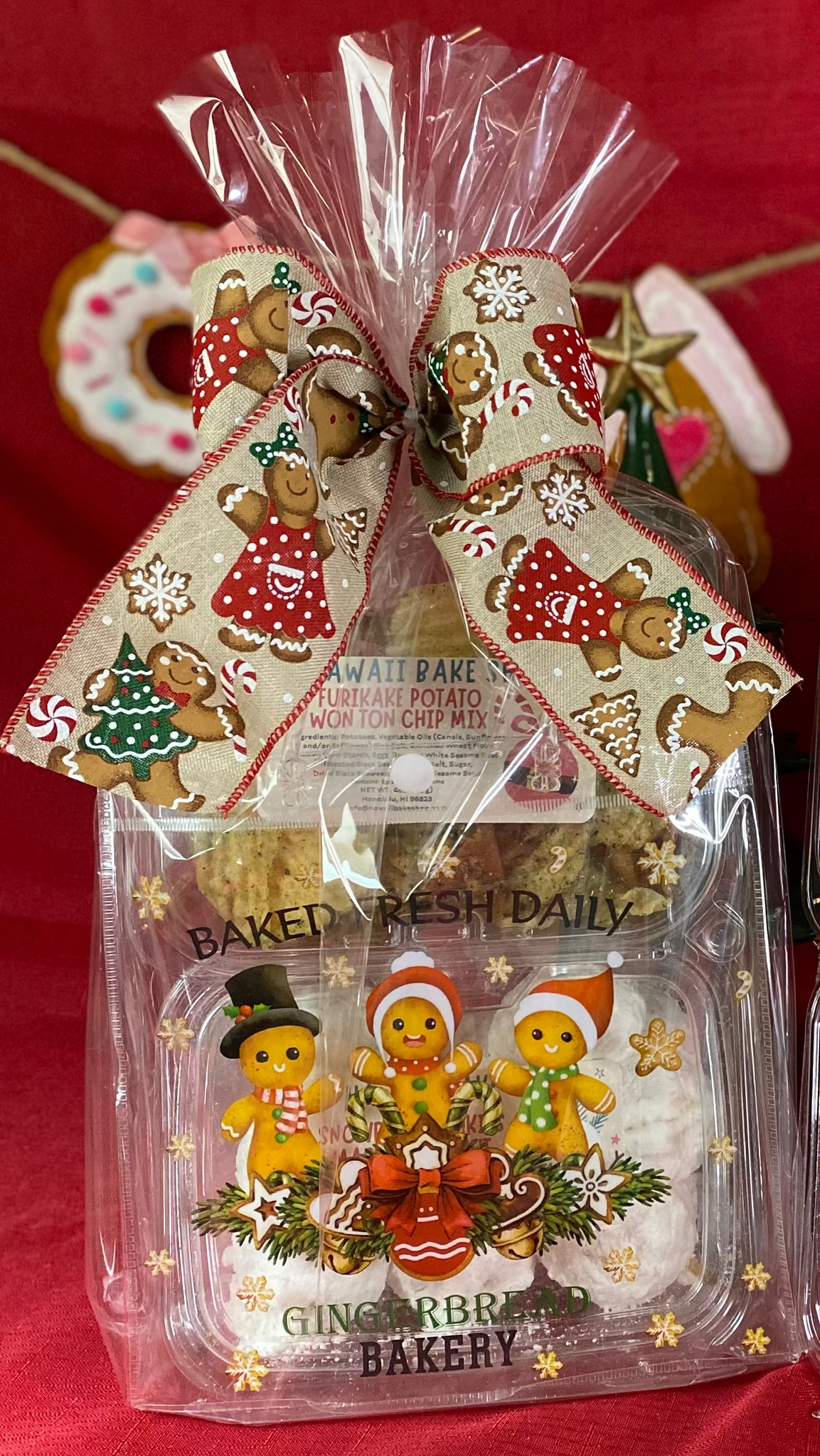 In Collaboration with Hawaii Bake Shop we are offering Holiday Container Gift Set your Choice of any two Holiday Containers wrapped in gingerbread vinyl gift bag with tag.